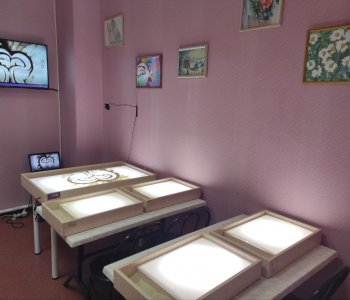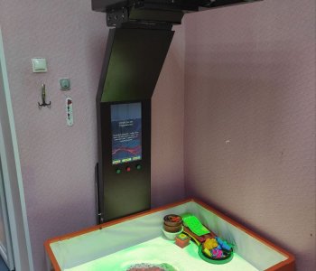 Оборудование: Интерактивная песочница iSandBox Standard (компьютер, мультимедийный проектор. сенсорный датчик глубины песка, монитор, светодиодное подсвечивание, панель управления, резервуар для песка). Световой стол преподавателя и 6 световых столов получателей для песочной анимации, мультимедийный комплект, песок, инструменты для рисования :кисти, лопаточки, трафареты,палочки.