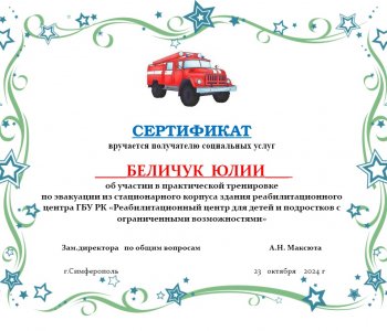 В рамках выполнения Плана мероприятий по комплексной безопасности на 2024 г. 23.10.2024 в 12-50 в ГБУ РК «Реабилитационный центр для детей и подростков с ограниченными возможностями» проведена плановая тренировка по отработке действий персонала, получателей социальных услуг и их сопровождающих в условиях чрезвычайной ситуации – угрозы возникновения пожара в помещениях стационарного корпуса.